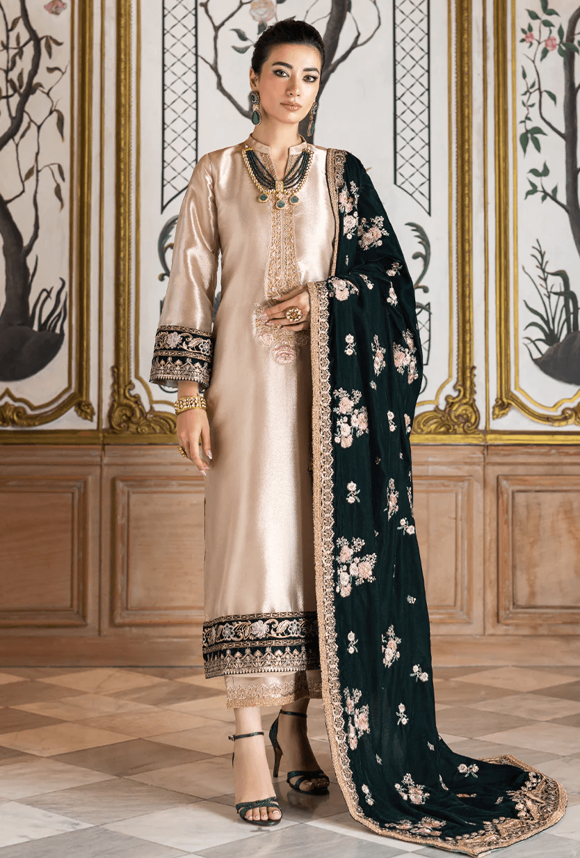 Experience luxury and elegance with the Zainab Chottani Unstitched D-03 SARWANA suit. Featuring intricate embroidery and a plush velvet shawl, this unstitched suit is perfect for any occasion. Elevate your style and make a statement with Zainab Chottani.